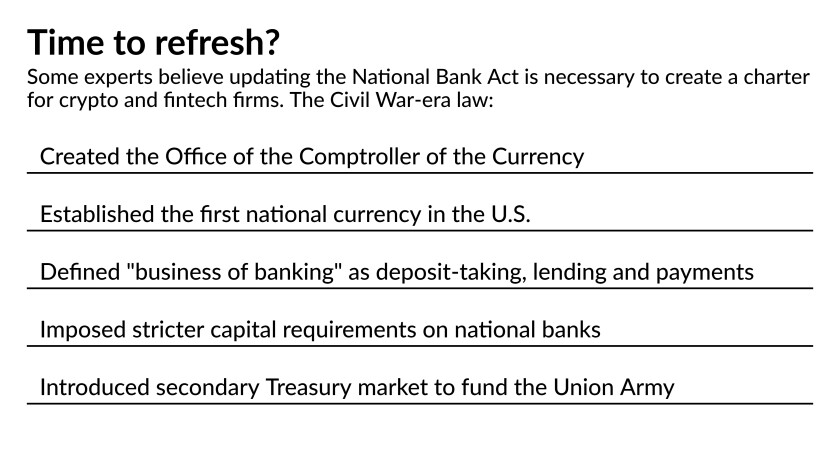 WASHINGTON — For years, federal regulators have struggled to set parameters for the inclusion of fintechs in the banking system. Some experts say the clearest-cut solution may be to revamp the National Bank Act.